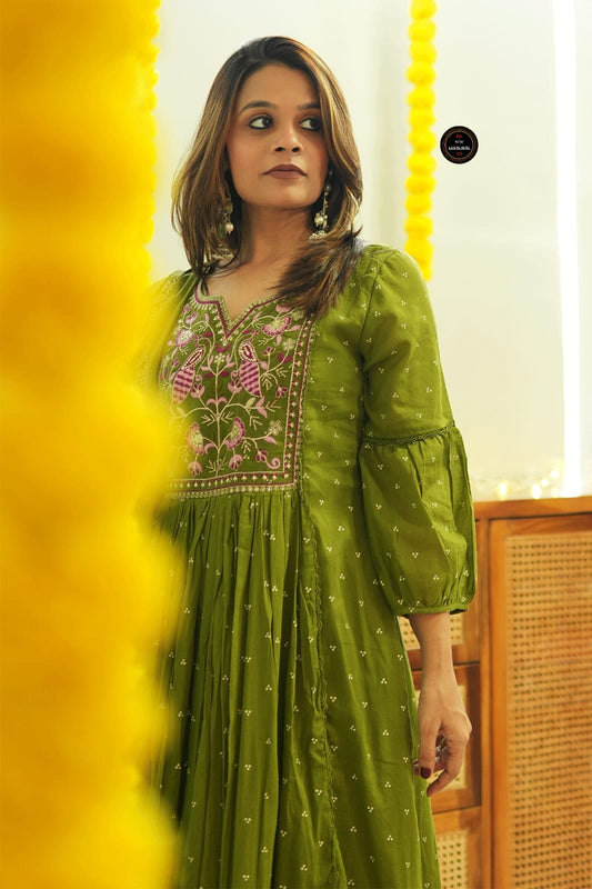 Olive Green Embroidered Cotton Anarkali Kurta