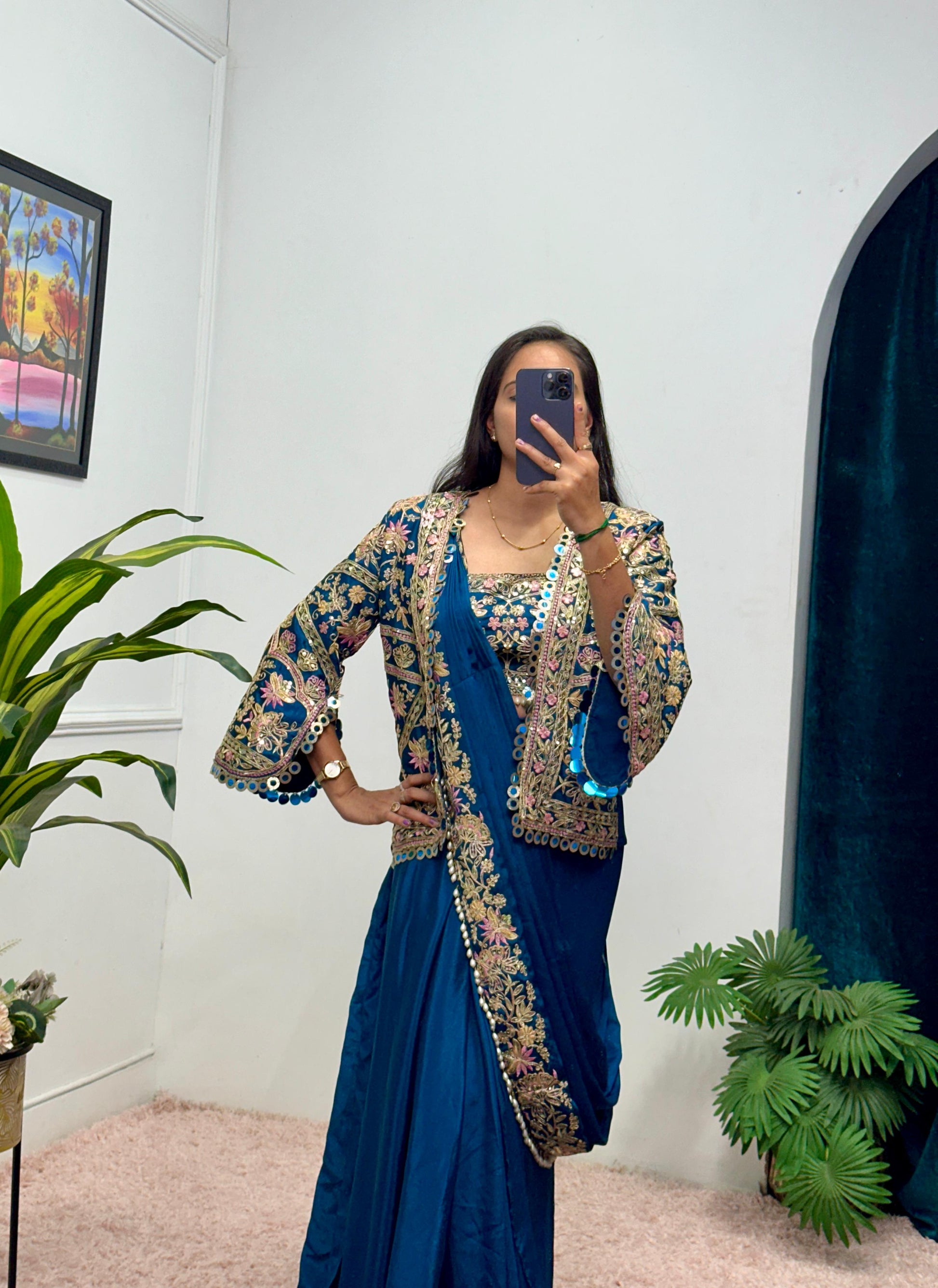Royal Blue Chinon Embroidery Moti Saree
